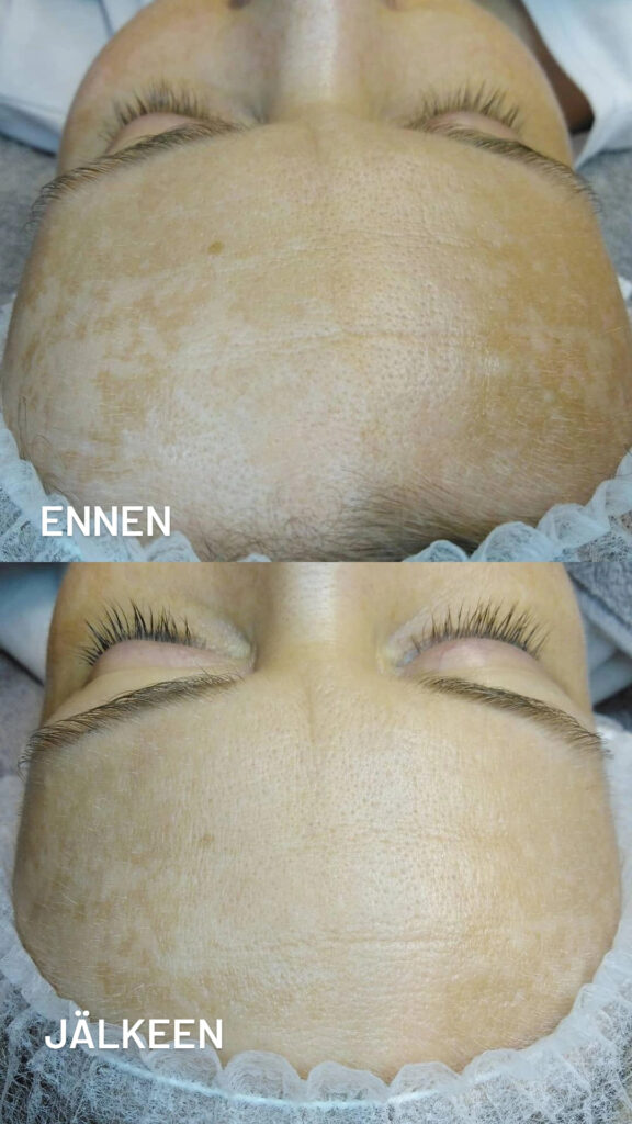 Alla ennen-jälkeen -kuva. Asiakkaalle tehtiin 4-kerran sarjahoitona mikroneulaus. Tavoitteena oli tasoittaa pigmenttimuutoksia.